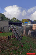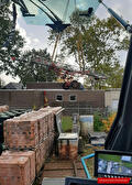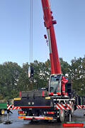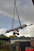 Maar ja dat is makkelijker gezegd als gedaan, het toegangspad daarheen is niet al te breed. Een kraanmachinist van de firma Mammoet heeft uitkomst geboden, hij heeft na intern overleg ons geholpen door de aanhanger door de lucht te transporteren.....