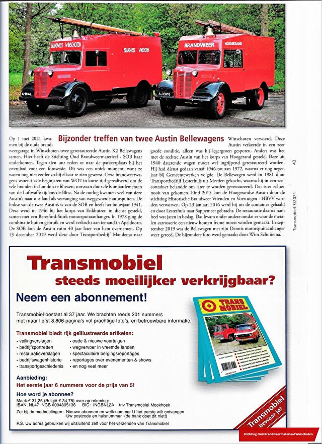 HBVV uit Sappemeer en onze Bellewagen schrapte hij alle andere afspraken voor die dag... zo'n kans wilde hij niet mislopen. De zaterdag van de fotosessie was het zeer mooi weer, dus de gemaakte foto's waren ook fantastisch. Wim was zo tevreden dat hij enkele afbeeldingen doorzond naar het magazin "Transmobiel". En ja hoor zij plaatsen een foto van Wim waarop beide Bellewagens naast elkaar staan.